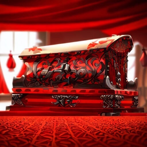 紅黑絲帶纏繞編成的掛繩穿過,絲帶和小棺本身的顏色也不搭。