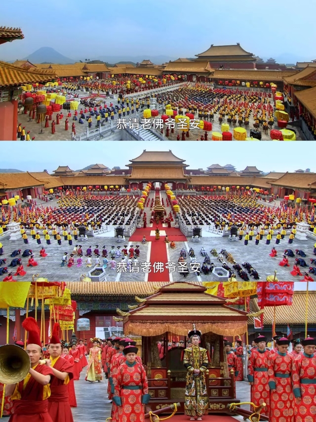 老佛爺端坐于十六人抬著的金頂鑾駕之中,面容慈祥安寧,目光所及之處皆是莊嚴(yán)肅穆的宮墻殿宇