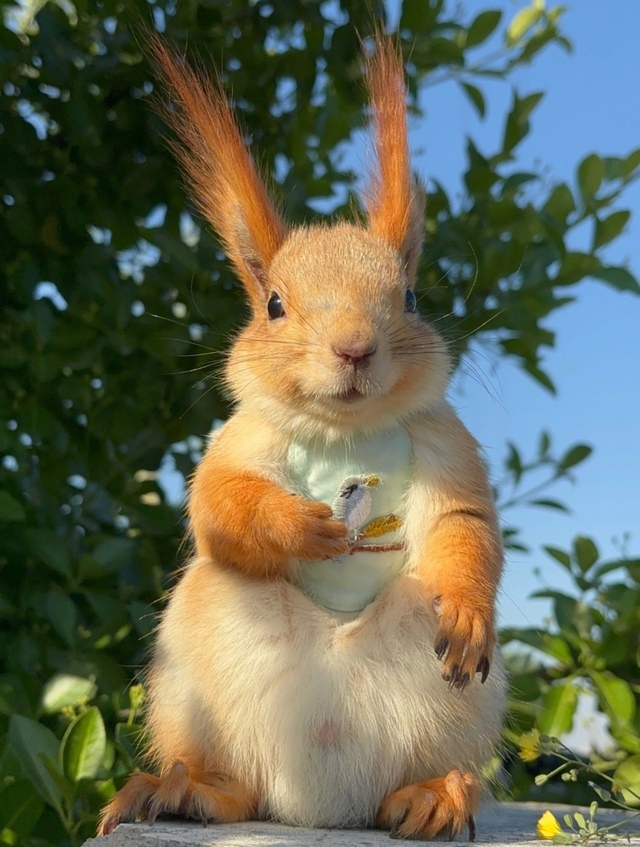 它圓潤(rùn)的身軀上嵌著一雙烏黑透亮的大眼睛,正用前爪緊緊抱著一顆大蘋果,歪著腦袋,好奇地注視著她的一舉一動(dòng)。