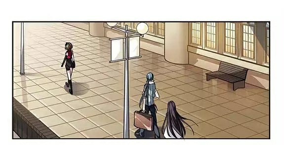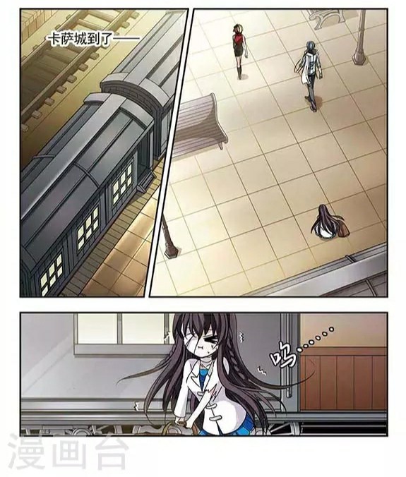 背后是又緩緩啟動的火車,在火車車廂上玻璃的照射下,一個(gè)幼小的女童坐在椅子上正在和行人交談,遠(yuǎn)處身高腿長,寬肩窄腰的黑色半長發(fā)紅眼睛的帥哥向這里走來