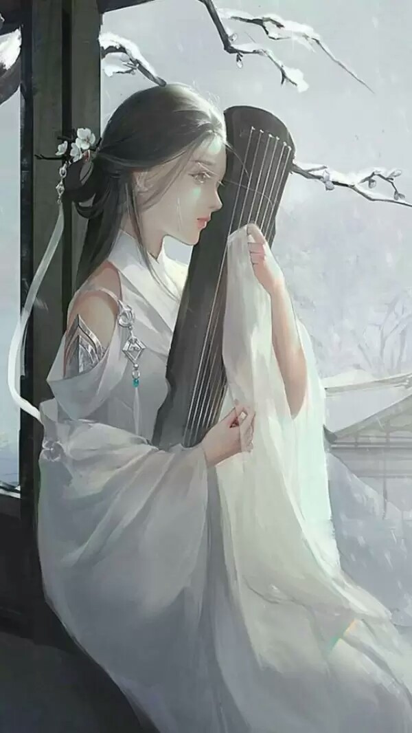 一個身穿白色輕紗古裝的女孩,傾國傾城的容顏,一頭烏黑的頭發(fā)被絲帶綁了起來,懷里抱著古琴。坐在蓮花池上的涼亭里。