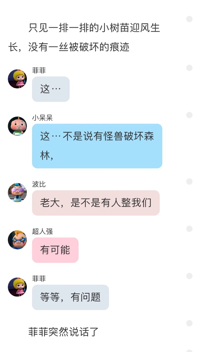 菲菲我記得這排樹(shù)是今天早上我們剛種的,種下去的時(shí)候,它只有一點(diǎn)點(diǎn)綠芽,只隔了一中午的時(shí)間它怎么就長(zhǎng)出的葉子??,所以這因該是毒幻蛾的幻境,只不過(guò)我們都中招了。