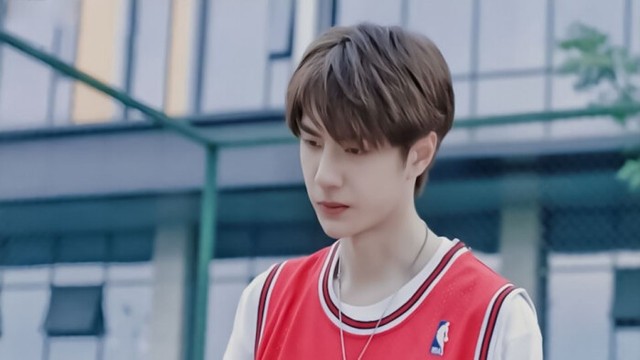 王一博已經換好了衣服,他穿著紅色的運動衫,帶著一身的少年氣息走來。