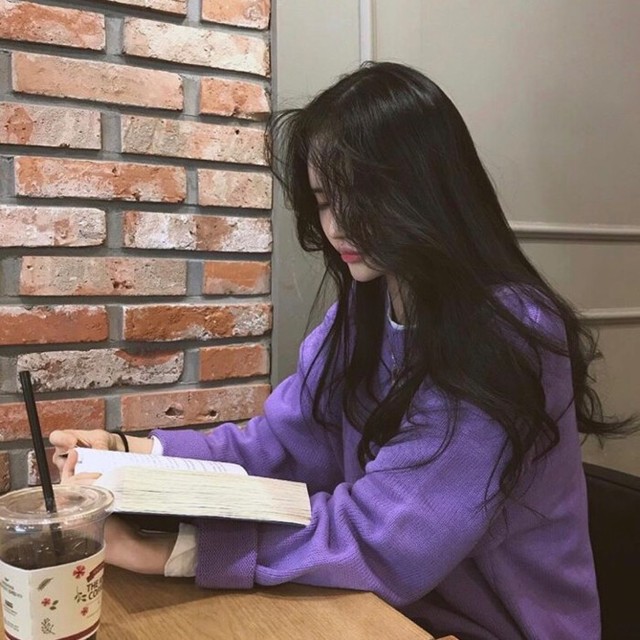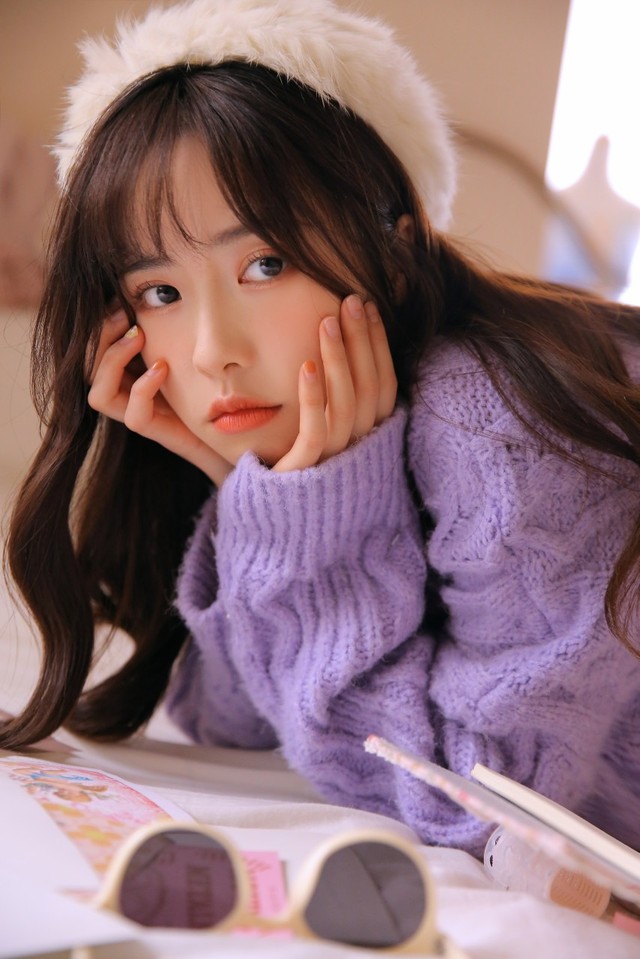 她穿著一身紫色毛衣,披著頭發(fā),戴著一頂貝雷帽
