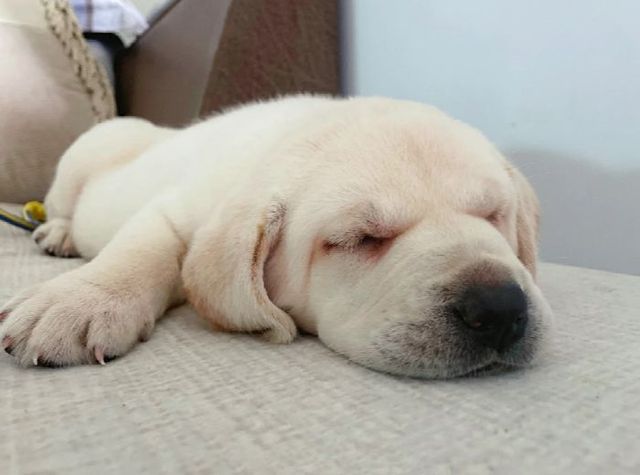 身型不是大型犬標(biāo)準(zhǔn),但絕對(duì)比小奶狗大,正在安詳?shù)厥焖?,發(fā)出呼嚕呼嚕的滿足聲,毛發(fā)溫順,身體一起一伏。